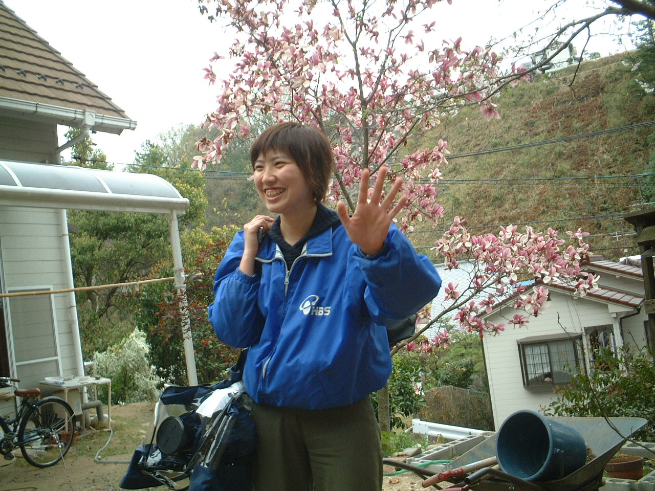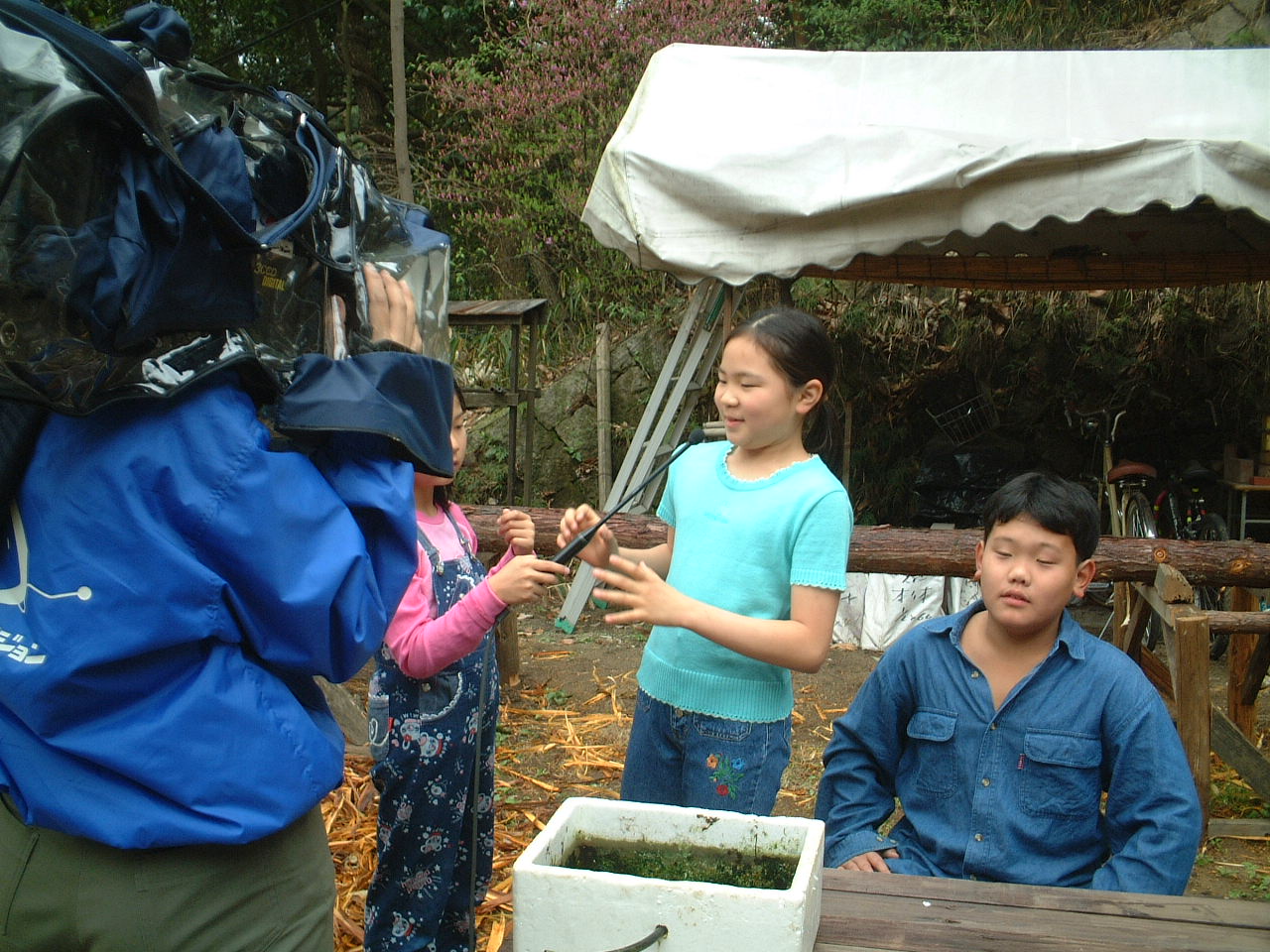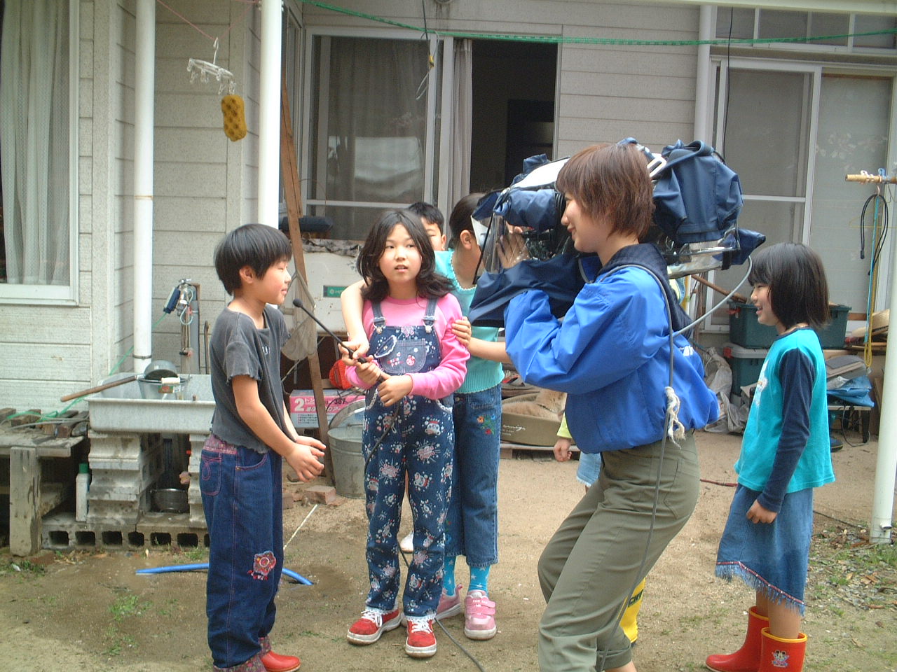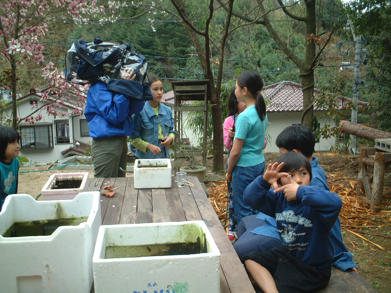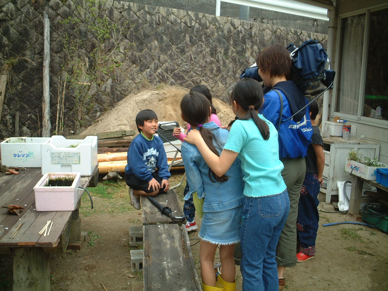 4月9日(月)午前 HBS西村さんから取材に行くと電話 12時半一人でHBSの車を運転して西村さん登場 重いカメラ 重い録音装置を一人で担いで取材 川に入ってカメラを回すときは長靴をお貸ししようとしたけど 平気です と 靴下を脱いで素足に靴をはき じゃぶじゃぶと川を歩いて カメラをまわしていた 子どもたちもそんな西村京子おねえさんにすぐなついて 下のようなポーズ