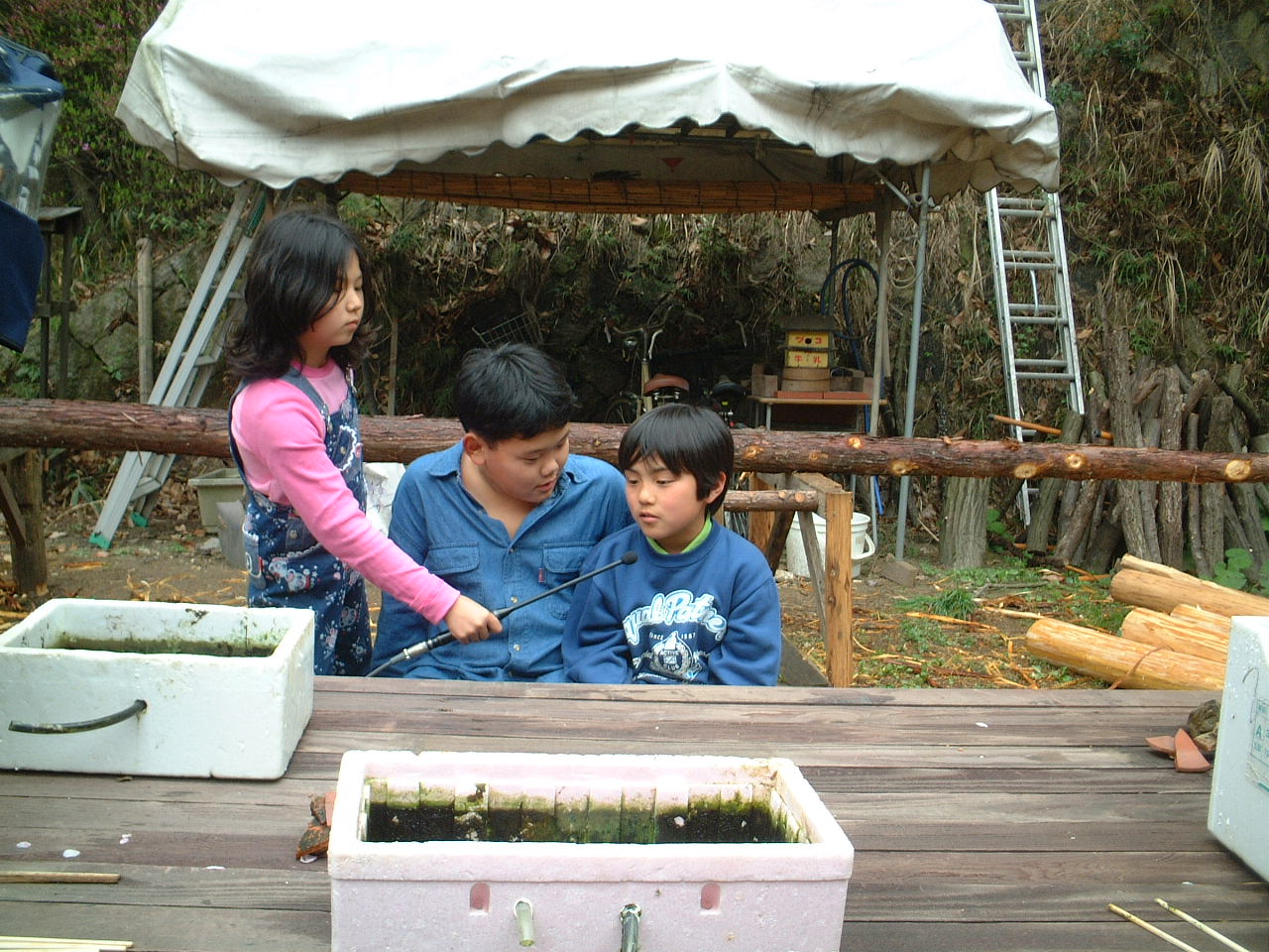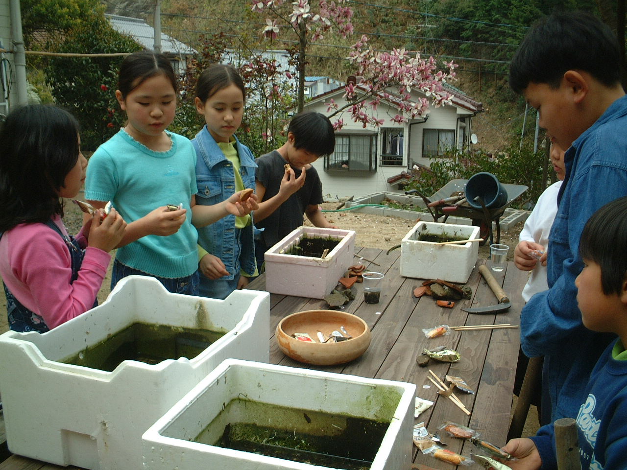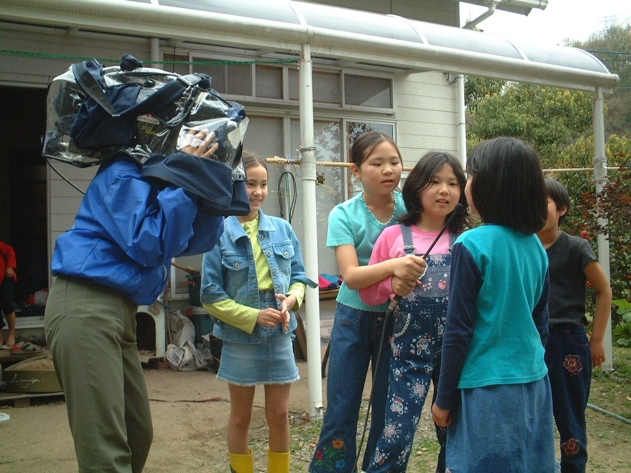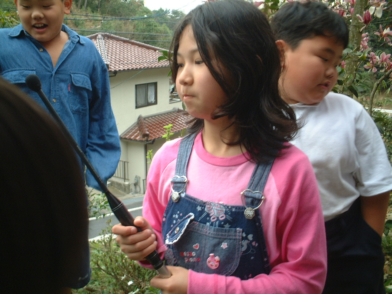 4月9日(月)午前 HBS西村さんから取材に行くと電話 12時半一人でHBSの車を運転して西村さん登場 重いカメラ 重い録音装置を一人で担いで取材 川に入ってカメラを回すときは長靴をお貸ししようとしたけど 平気です と 靴下を脱いで素足に靴をはき じゃぶじゃぶと川を歩いて カメラをまわしていた 子どもたちもそんな西村京子おねえさんにすぐなついて 下のようなポーズ